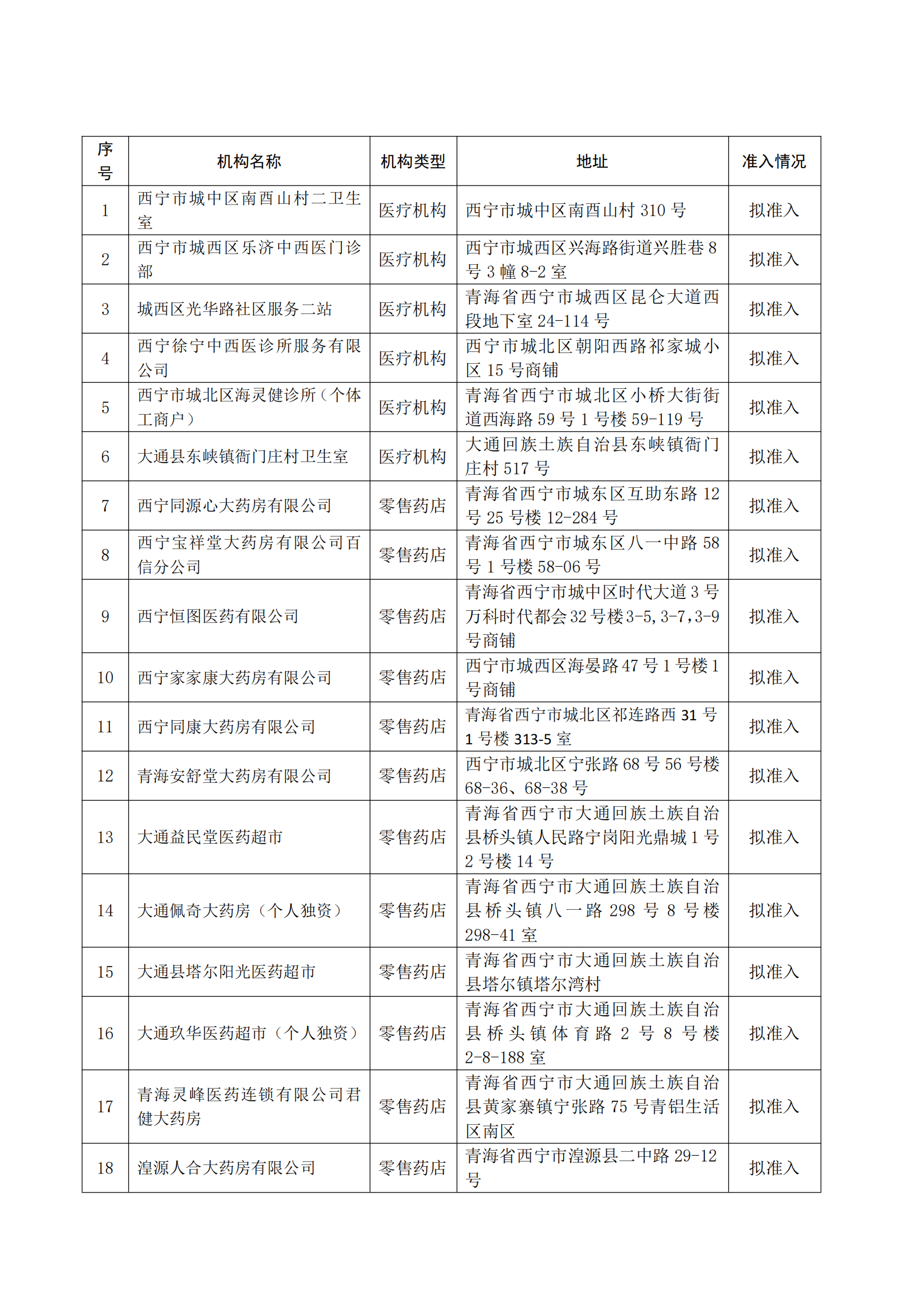 西宁市拟纳入青海省基本医疗保险定点医药机构名单