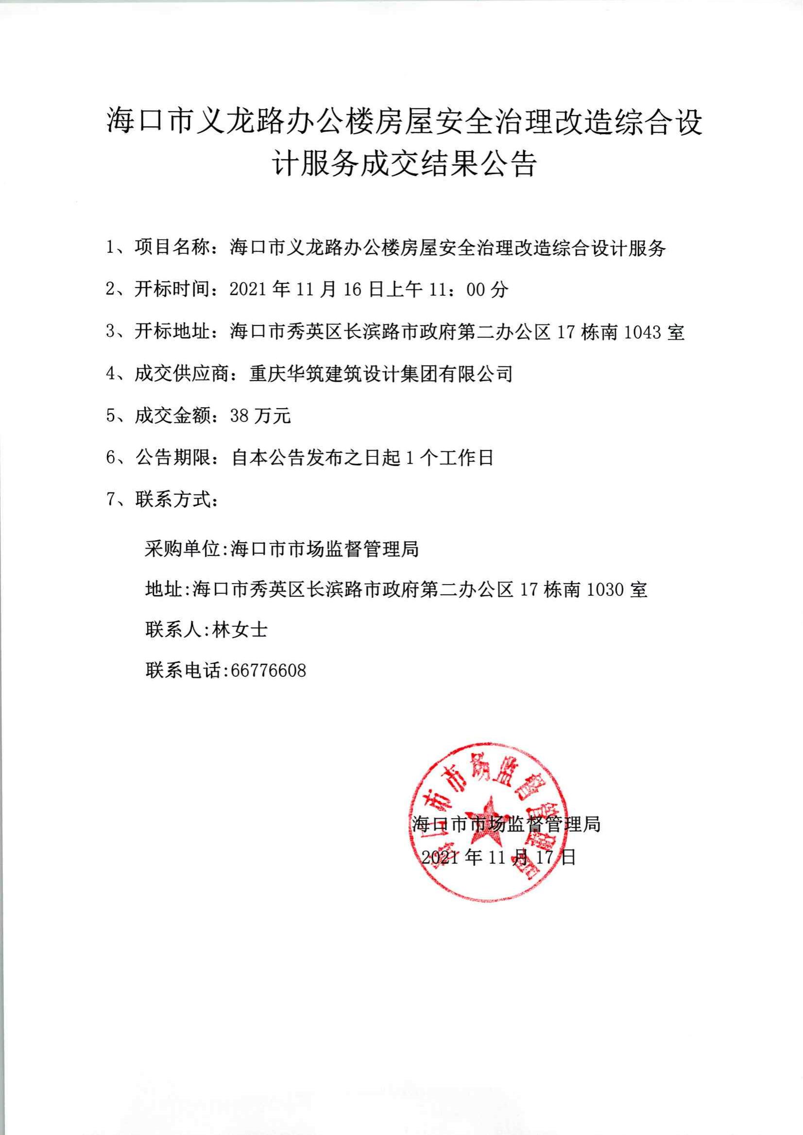海口市义龙路办公楼房屋安全治理改造综合设计服务成交结果公告
