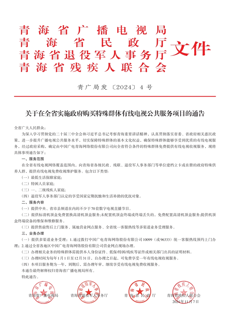 关于在全省实施政府购买特殊群体有线电视公共服务项目的通告