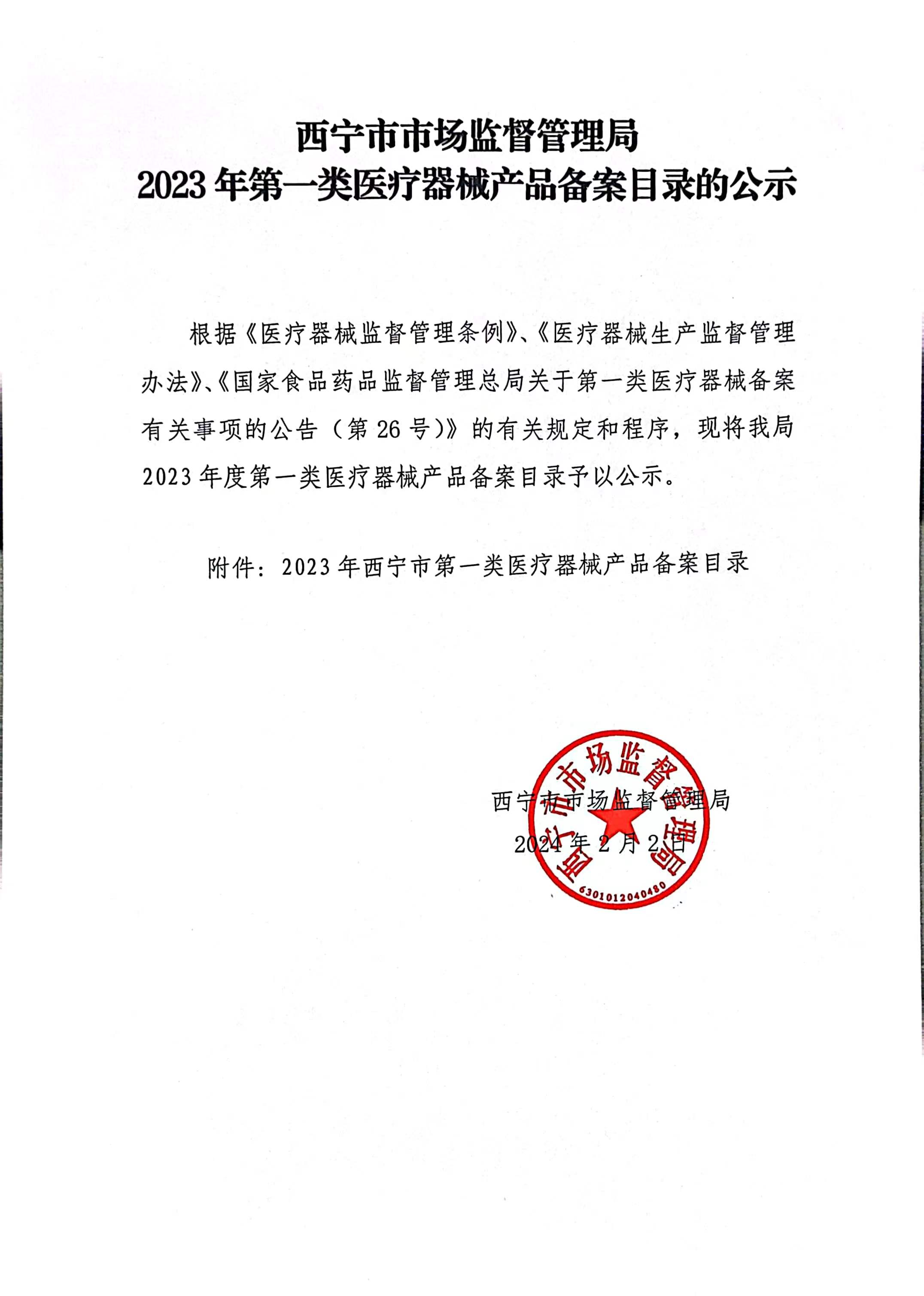 根据《医疗器械监督管理条例》、《医疗器械生产监督管理办法》、《国家食品药品监督管理总局关于第一类医疗器械备案有关事项的公告(第26号)》的有关规定和程序,现将我局2023年度第一类医疗器械产品备案目录予以公示。